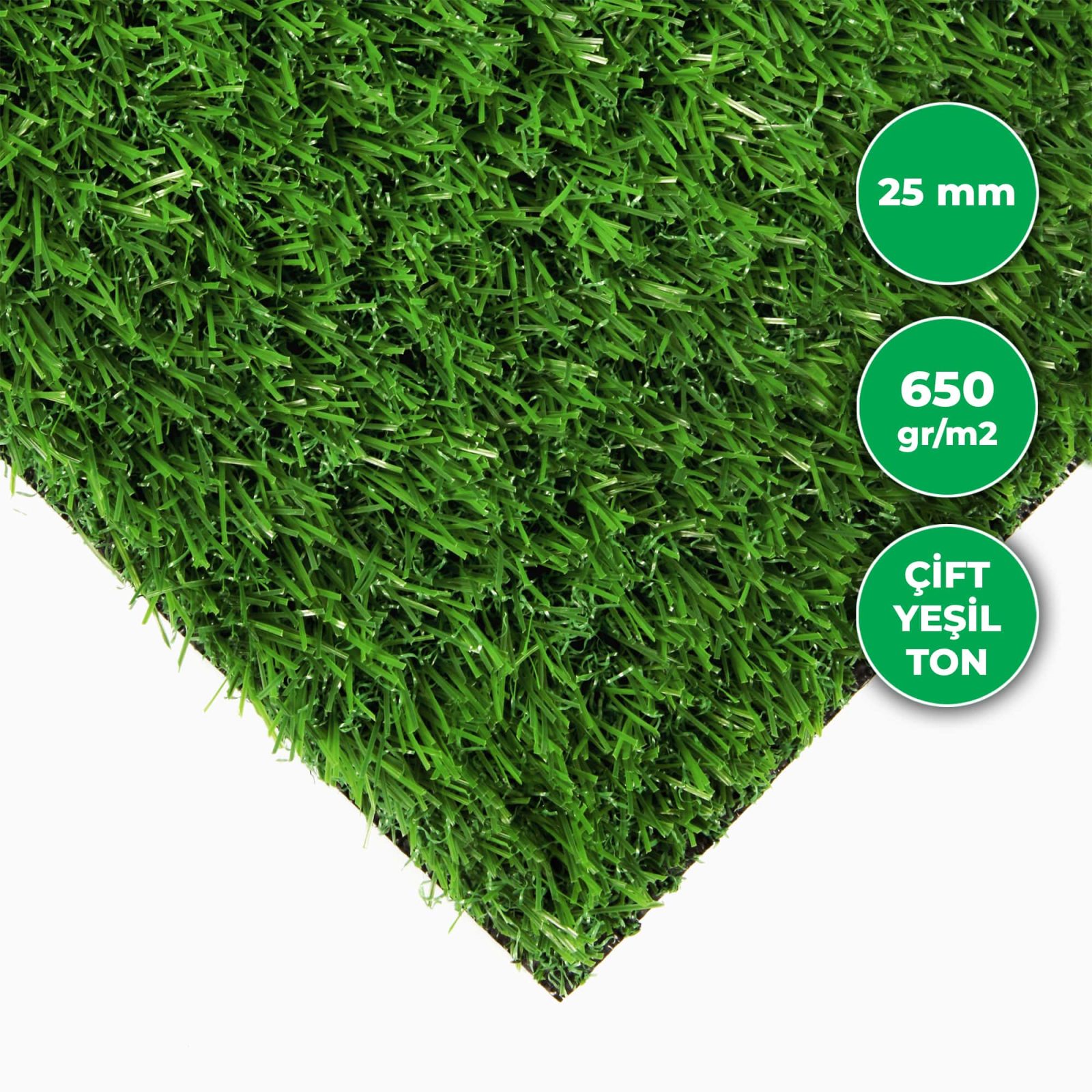 Yeşil çift tonlu gerçekçi, otlu suni çim. Yüksek gramaj ve yumuşak dokuludur.